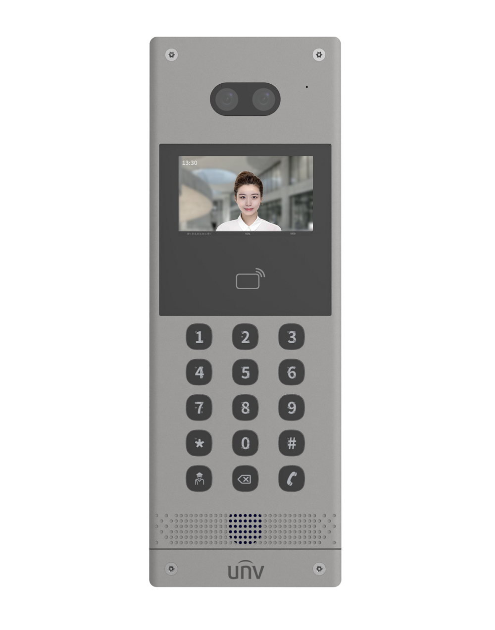 CMOS 2Мп цветный объектив, WDR; Web интерфейс; Хранилище: 15,000 карт и 15,000 лиц, Встроенный микрофон и динамик, PoE, 1 RS485 интерфейс, 1 Wiegand, 2 реле, тревожные вх./вых. 4/2, Распознавание лиц, IP65, IK08, -40°C ~ 60°C, Металл, Поддержка приложения UNV-Link